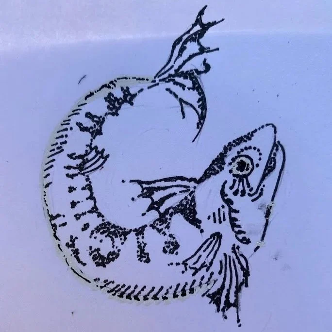 I was taken by these mackerel on a Scottish fiver, drew one of them in fine liner, and adapted and refined the picture into a series of characters and stamps over the course of a year.
